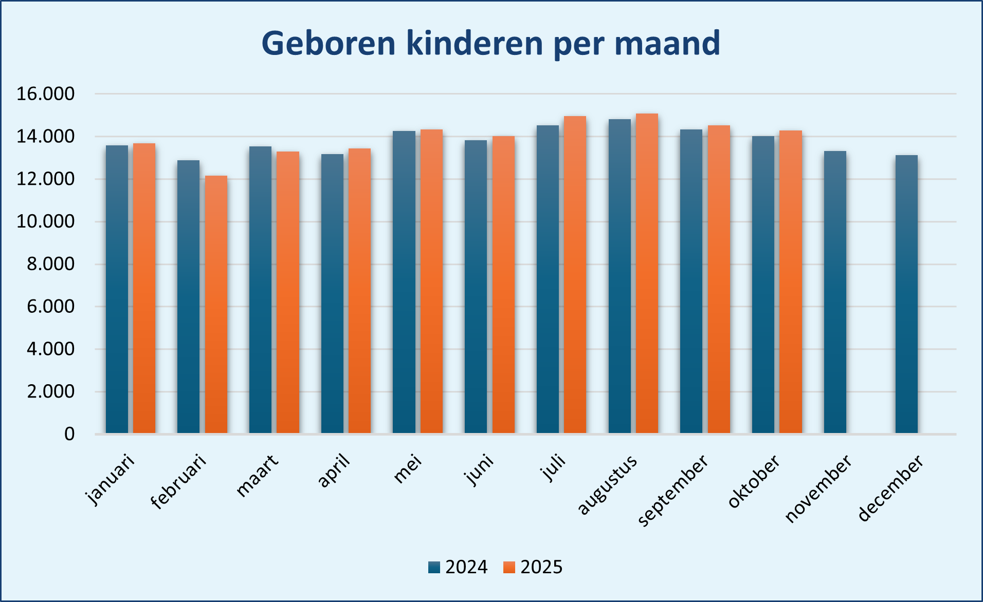 Onderstaande grafiek toont de ontwikkeling van het aantal levend geboren kinderen per maand in Nederland in 2025, vergeleken met 2024. In oktober 2025 (14.284) werden er 266 meer levend geboren kinderen geregistreerd dan in oktober 2024.