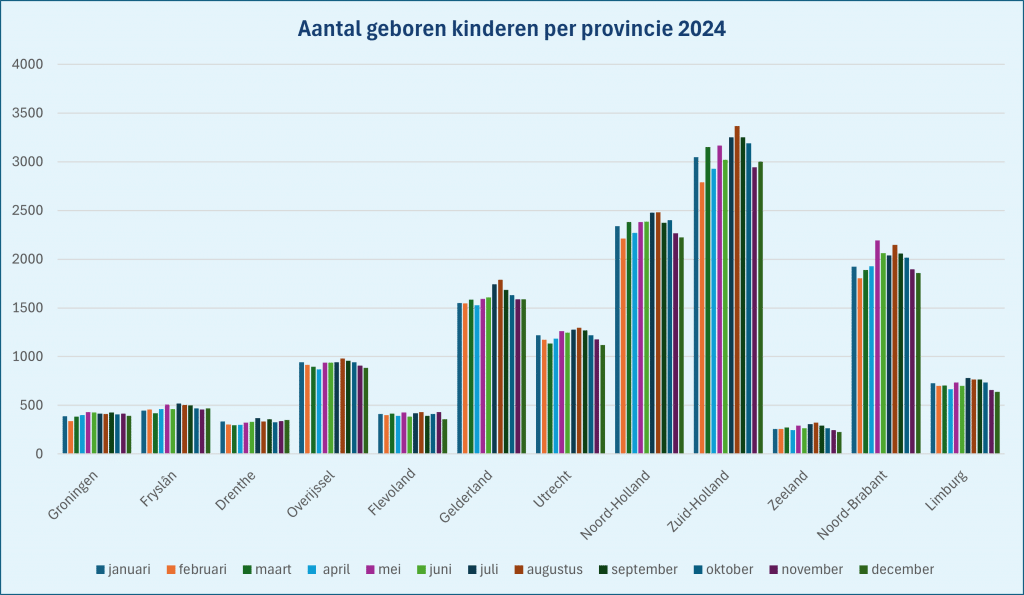 Per provincie worden de meeste kinderen geboren in Zuid-Holland (3.257 in oktober 2025) en in Zeeland (288 in oktober 25) is het aantal levend geboren kinderen het laagst.