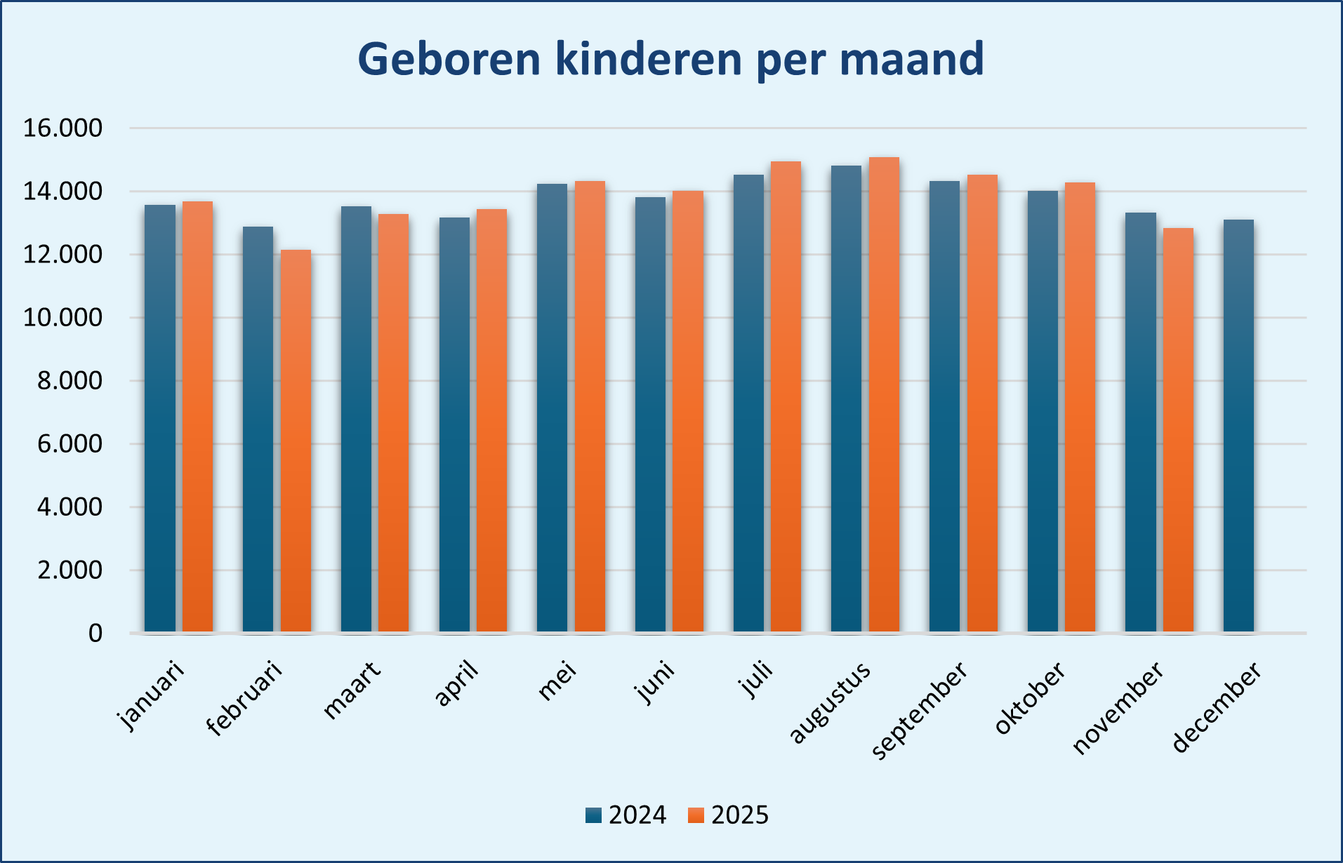 Onderstaande grafiek toont de ontwikkeling van het aantal levend geboren kinderen per maand in Nederland in 2025, vergeleken met 2024. In november 2025 (12.853) werden er 469 minder levend geboren kinderen geregistreerd dan in november 2024.