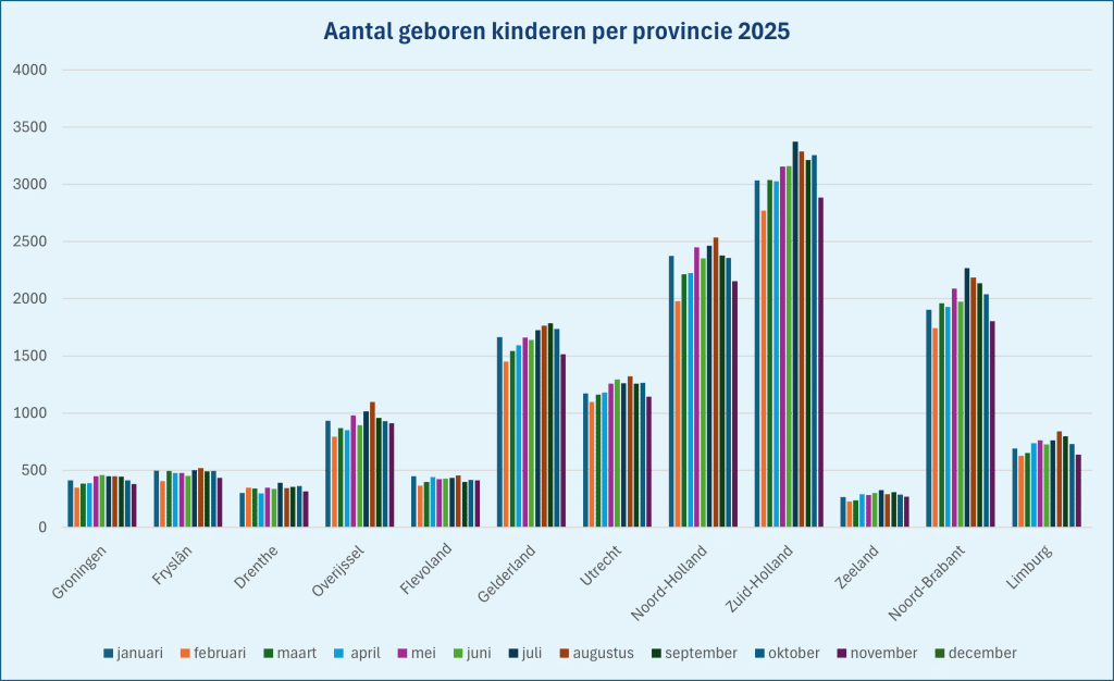 Per provincie worden de meeste kinderen geboren in Zuid-Holland (3.257 in oktober 2025) en in Zeeland (288 in oktober 25) is het aantal levend geboren kinderen het laagst.